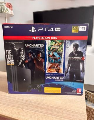 Consola Playstation 4 Pro en color negro, con capacidad de 1TB y compatibilidad 4K HDR. Incluye varios títulos de la saga Uncharted. - The Last of Us Remasterizado - Uncharted: El Legado Perdido - Uncharted 4: El Desenlace del Ladrón - The Uncharted: The Nathan Drake Collection