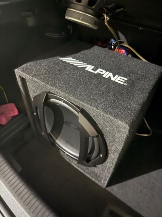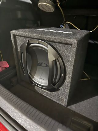 Subwoofer Alpine en caja, listo para instalar. - Diseño moderno y robusto. - Acabado en tela gris. - Rejilla protectora negra. 200 WATTS