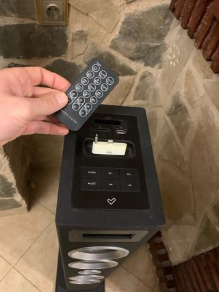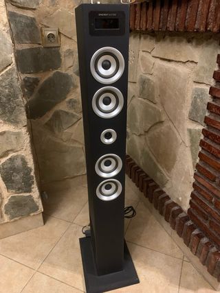 Torre de sonido de la marca Energy Sistem en color negro. Cuenta con una pantalla superior y múltiples altavoces. EXCELENTE PARA UNA TERRAZA, LIGERO PARA UNA PISCINA O CUARTO. - Diseño vertical y elegante. - Pantalla informativa en la parte superior. - Varios altavoces de diferentes tamaños. -Mando a distancia -USB, tarjeta SD, ipod, adaptador iphone viejo y cable AUXILIAR. - Radio am/fm