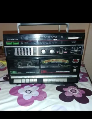 Radio cassette Sanyo con doble pletina y sintonizador. - Doble pletina para grabar cintas. - Sintonizador de radio AM/FM. - Altavoces integrados.
