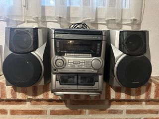 Minicadena Philips de 180 watios de potencia, con reproductor de CD triple, radio FM/AM y doble pletina de cassette. - Reproductor de 3 CD's compatibles con CD, CD-R/RW. - Sintonizador de radio FM/AM con antena por cable. - Doble pletina de cassette con auto-reverse. - Pantalla digital. - Supersurround. - Altavoces estéreo de 3 vias. 6 Ohm. - Sonido espwctacular de gran potencia. Muy bien conservada. Todo funciona correctamente.