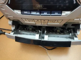- Diseño compacto, con la unidad central y los altavoces separables a juego (cables incluidos), característico de la marca en los 90, Ideal para aficionados a lo retro. - Dispone de entrada auxiliar trasera (AUX) para conectar dispositivos externos, y una salida para auriculares y micrófono. - Mando a distancia. - Incluye, sintonizador de radio AM/FM y una doble pletina de casete. (El reproductor de CD no funciona) La potencia real (RMS) es de aproximadamente 10 W + 10 W por canal. Los altavoces incluidos suelen tener una impedancia de 6 ohmios.Incorpora el sistema Super T-Bass para realzar los graves y ajustes predefinidos.