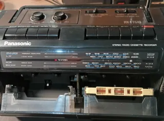 Radio cassette Panasonic en color negro. Disfruta de tu música favorita con este clásico. - Doble pletina. - Sintonizador de radio AM/FM. - Altavoces estéreo. Funciona perfectamente