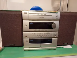 Minicadena Panasonic con reproductor de 5 CDs y doble pletina de cassette. - Reproductor de CD con cargador de 5 discos. - Doble pletina para cassettes (Deck 1 y Deck 2). - Sintonizador de radio. - Pantalla digital. - Mando a distancia. Desperfecto en la tela de un altavoz.