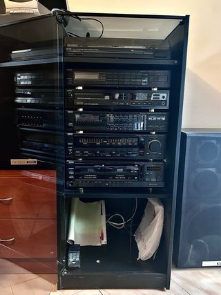 Minicadena antigua con múltiples funciones. - Incluye tocadiscos para vinilos. - Doble pletina para cassettes. - Sintonizador de radio. - Ecualizador gráfico.