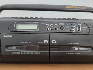 Radio cassette Sanyo con función Bass Expander. Un clásico para disfrutar de tu música. Comprobado enchufado a red electrica y funciona. - Doble pletina. - Sintonizador AM/FM. - Asa para transporte.