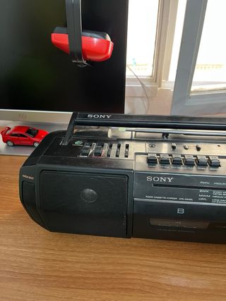 Radio cassette portátil de la marca Sony. - Reproductor de CD. - Sintonizador de radio AM/FM. - Reproductor de cintas de cassette.