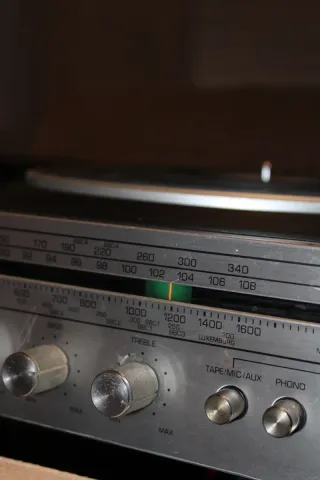 Radio antigua con un diseño retro y elegante. - Acabado en madera y metal plateado. - Altavoz circular. - Dial de sintonización con aguja. - Múltiples perillas y selectores. - disponible de Antena y transformador. Funciona bien. También se pueden escuchar cassettes de música. Bastante bien conservada