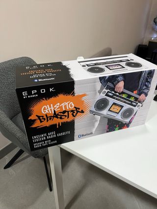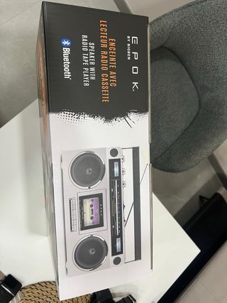 Altavoz con diseño retro que combina tecnología moderna y un toque nostálgico. - Conectividad Bluetooth. - Reproductor de radio y cassette integrado.