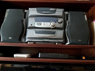 Mini cadena de música Samsung con un diseño moderno.tiene 3 cds que no funcionan bien 2 cassettes,radio,mando a distancia,instrucciones,2 altavoces - Acabado en plata y negro. - Incluye altavoces.