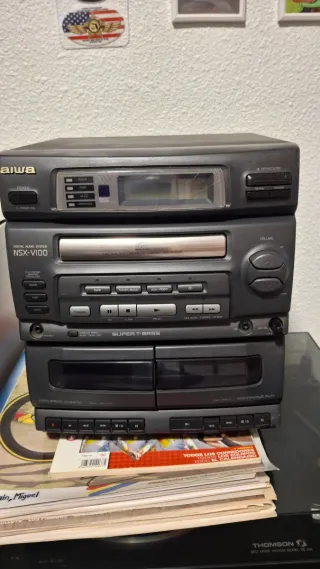 Equipo de sonido Aiwa con reproductor de CD y doble pletina. - Reproductor de CD. - Doble pletina de cassette. - Sintonizador de radio. - Función Super T-Bass.