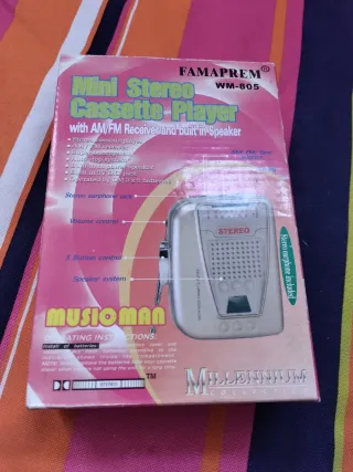 Nuevo a estrenar con el embalaje original. Mini radiocasete estéreo tamaño walkman Marca Famaprem modelo WM-805 Una preciosidad de los años 80. Antiguo vintage radio cassette casete colección coleccionismo Mini radio cassette portátil con altavoz incorporado. - Modelo WM-805. - Sintoniza AM/FM. - Diseño plateado. - Incluye antena extensible.