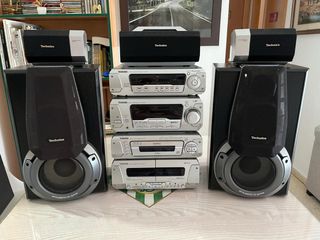 Equipo de música Technics en estupendo estado. Incluye dos altavoces, un amplificador, un reproductor de CD, un sintonizador y una bandeja de cassette. Todos los componentes están en perfecto estado estético. - Sistema de sonido envolvente. - Incluye todos los componentes mostrados en la imagen.