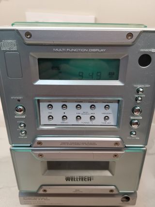 Minicadena welltech. En este caso la vendería como Radio con mando a distancia,ya que el CD a veces no lee y tiene el cierre roto, y la pletina me ha enganchado algún cassette,(los altavoces solo ya lo valen). Mando incluido. (sin pilas).medidas Ancho x Alto x Fondo. 51 x 26 x 26.Precio negociable.