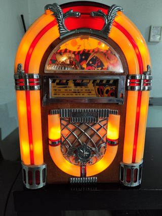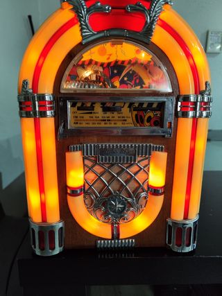 radio cassette Jukebox funciona perfectamente la luz, la radio y la reproducción del cassette, solo le falta la tapita de cierre decorativa únicamente