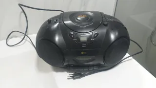 Características Principales Este dispositivo combina varias funciones de audio en un diseño compacto: Reproductor de CD: Cuenta con un lector de discos compactos en la parte superior. Radio: Incluye sintonizador de radio FM/AM. Reproductor de Cassette: Tiene una platina frontal para reproducir cintas de cassette. Audio Estéreo: Dispone de dos altavoces integrad