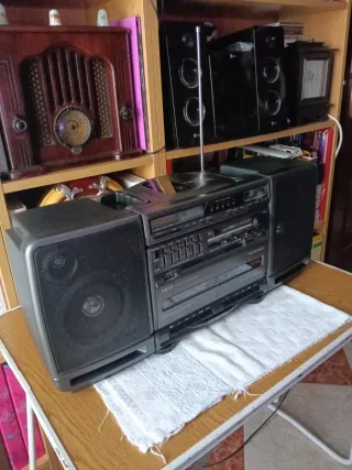 Boombox Sharp WQ-T232 de doble cassette en color rojo, muy buen estado estetico, funciona la radio pero el cassette no. - Radio. - Doble cassette. - Ecualizador gráfico de 3 bandas. - Altavoces de 2 vías y 4 altavoces.