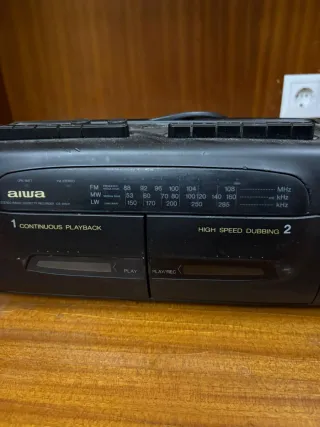 Radiocasete Aiwa con reproductor de cassette y radio. - Diseño portátil con asa. - Sintonizador de radio AM/FM. - Doble pletina de cassette. - Función Continuous Playback.