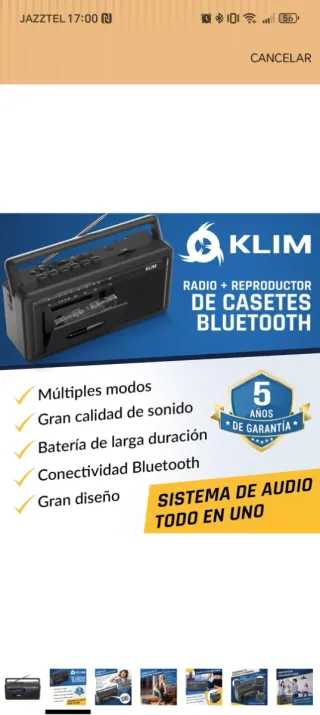 Reproductor de cassette KLIM con radio AM/FM. Diseño moderno y funcional. - Asa para transporte. - Puerto USB y entrada auxiliar. - Altavoz integrado.