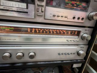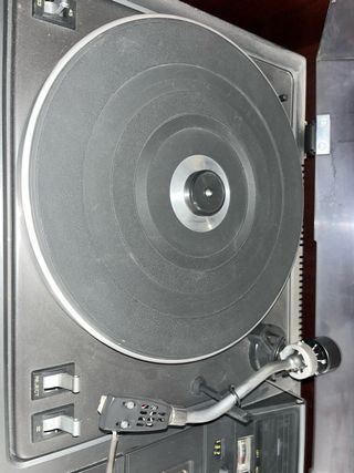 Sistema de audio Sanyo con tocadiscos y radio. - Tocadiscos con plato giratorio. - Radio AM/FM. - Reproductor de cassette. - Controles de ecualización y balance. - No se envía, recogida en mano