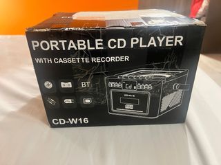 Vendo reproductor portátil de CD con grabador de cassette, modelo CD-W16, completamente nuevo en su caja original! Ideal para amantes de lo retro o para digitalizar tus viejos cassettes. Características principales: • Reproduce CDs y graba en cassette. • Conexión Bluetooth para conectar a altavoces o auriculares inalámbricos. • Puerto USB y ranura para tarjeta SD para reproducir música digital. • Radio FM/AM integrada. • Batería recargable para usarlo en cualquier lugar (o con adaptador de corriente). • Diseño compacto y portátil, perfecto para el coche, viajes o casa.