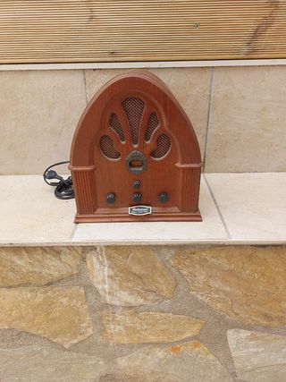 Radio imitacion vintage funciona perfectamente.Tiene AM-FM-AFC dispone de acceso para cassette no probado,va 220v.De madera bonita incluso para decoración.