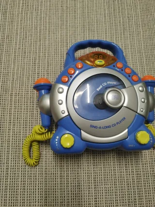 Equipo de música para cantar con tus CDs favoritos. Incluye dos micrófonos para duos. - Diseño divertido y colorido. - Asa para fácil transporte. - Botones de control de reproducción. - Funciona a pilas