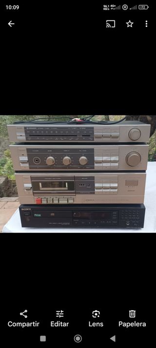 Equipo de música Pioneer años 90, completo: Amplificador, necesita reparación . Radio,en perfecto estado. Lector disc doble, en perfecto estado. Cassette, doble pletina, en perfecto estado. Valioso equalizador GR 777, en perfecto estado. Altavoces de 1m de alto aprox. Mueble del equipo.