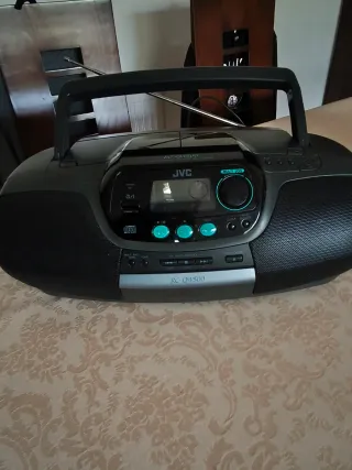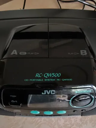 Radio CD portátil JVC RC-QW500 en color negro y detalles en verde. Doble pletina, CD, radio. No tengo el mando. Puede usarse con pilas. La salida del CD es lo único que falla un poco, tienes que ayudar a que salga al final y empujar un poco para cerrarla, pero funciona perfectamente.