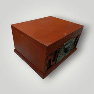 Radio y reproductor de CD con un diseño retro y elegante. - Acabado en madera oscura. - Frontal con rejilla y dial de sintonización. - Botones de control. Funciona. No es un sonido espectacular en cuanto a calidad y tal pero funciona todo. Es más bien decorativo y de forma puntual se puede usar.
