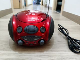 Vendo equipo de música Suntech PXRC5CD estilo retro, prácticamente nuevo y con un sonido magnífico. Perfecto para decorar y para disfrutar de música con un estilo clásico. ✔ FUNCIONES: Tocadiscos (vinilos) Radio FM/AM Reproductor de CD Cassette Entrada AUX para conectar el móvil con cable Altavoces potentes y de gran calidad Mueble de madera muy elegante Todas las luces y mandos funcionan perfectamente ❗NOTA: El puerto USB no funciona, por eso lo dejo a buen precio. 📏 MEDIDAS: 24 cm (alto) × 46 cm (ancho) Equipo limpio, cuidado y funcionando (excepto USB). Ideal para salón, decoración vintage o amantes del sonido clásico.