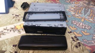 Reproductor Sony para coche en buenas condiciones. Incluye radio AM/FM, CD, entrada auxiliar, y función de teléfono. Tiene un diseño elegante y compacto. - Reproduce CD y radio AM/FM. - Entrada auxiliar. - Función de teléfono integrada. - Controles intuitivos.