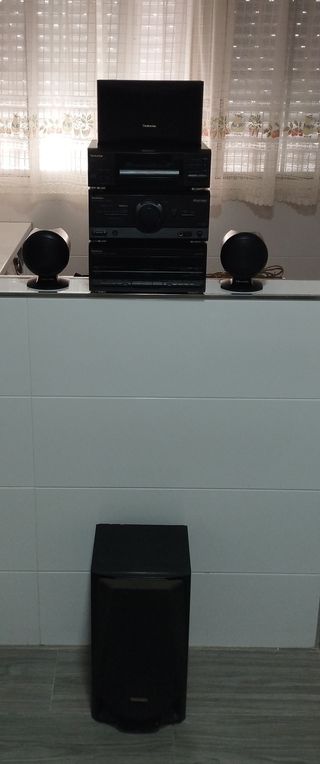 Equipo de música Technics SH-EH 790 en muy buen estado, Radio con RDS, cargador 5 cd, doble pletina, con sus 5 altavoces, mando a distancia y todos los cables. Funciona perfectamente como el primer día. Como se aprecia en las fotos tiene dos desperfectos en la tela que cubre los altavoces ambientales fruto del roce con un sofá, que no afecta para nada a la calidad del sonido.