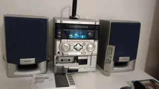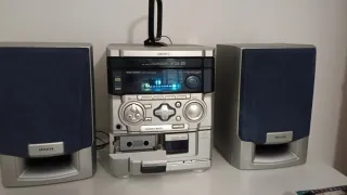 Mini cadena de sonido Aiwa modelo con un diseño moderno y elegante. Funciona bien la radio y el reproductor de CD son 3 también funciona estupendamente.Los altavoces suenan muy bien. Las pletinas de los cassettes la de la izquierda no cierra y creo que no funcionan. De ahí su precio!!! - Altavoces en color azul y plata. - Unidad central plateada.