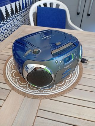 Radio cassette Sanyo en buen estado. Funciona con corriente. - Reproduce CDs y casetes. - Diseño clásico y compacto. - Incluye cable de alimentación.