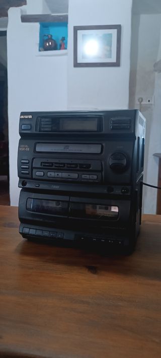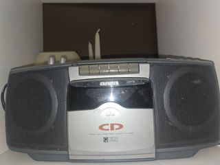 Reproductor de música Aiwa en buen estado. Incluye radio, reproductor de cassette y de CD. - Funciona con corriente eléctrica. - Diseño compacto y portátil. - Ideal para amantes de la música retro. También se le puede poner pilas de las grandes. Ideal para apagones. Creo que el CD no funciona.