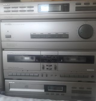 Minicadena Nokia en color plata, un sistema de sonido completo. - Sintonizador digital AM/FM con 24 memorias. - Amplificador estéreo integrado. - Doble pletina de casete con auto-reverse. - Reproductor de CD. - Control de volumen giratorio.