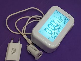 Krontaler Digi-Tech 9377 4-AN0123-3 Reloj digital . Carga por USB.. no usa pilas..cargador para casa y para coche incluidos. Indicador de carga y de batería baja Funcion sensor de iluminación on / off .. permite una sutil iluminación del display por la noche.. Boton de encendido / apagado. Util para viaje.. Hora y fecha radio controlada y ajustada por estación de referencia horaria ( señal inalámbrica desde servidor horario DCF77 ) 2 alarmas distintas seleccionables. Funcion retardo snooze e iluminación tocando el marco del display.. Formas redondeadas Patas de goma antideslizantes Mide 11 x 7.5 x 4.5cm
