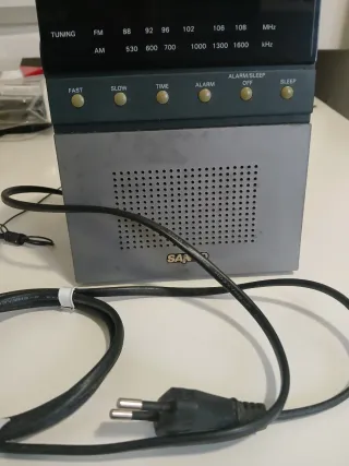Radio despertador Sanyo con funciones de alarma y temporizador. - Sintonizador FM/AM. - Botones de control: Fast, Slow, Time, Alarm, Alarm/Sleep Off, Sleep. - Altavoz integrado.