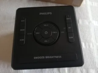 Radio despertador portátil de la marca Philips. - Diseño compacto ideal para viajes. - Color principal gris oscuro con detalles en azul. - Incluye función de Snooze. Pila de bateria para cambiar funciona bien .