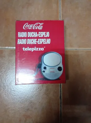 Radio ducha con función de espejo, un artículo promocional de Coca-Cola y Telepizza. - Diseño compacto y funcional. - Incluye espejo. - Logo de Coca-Cola visible.
