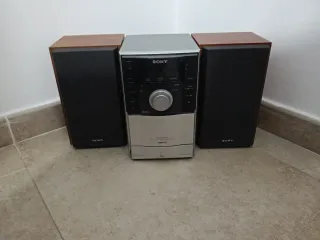 Mini cadena musical Aiwa con reproductor de CD, radio y doble pletina de cassette. Un sistema de sonido completo para disfrutar de tu música. Funciona perfectamente la radioy Los cd. Los cassettes de la doble pletina no. No mando a distancia. - Diseño plateado y azul. - Altavoces Aiwa incluidos.