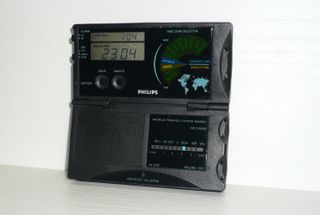 Radio reloj portátil de la marca Philips, modelo AE4230/00. Un dispositivo compacto y funcional. - Pantalla digital para la hora y alarma. - Selector de zona horaria mundial. - Sintonizador de radio FM.