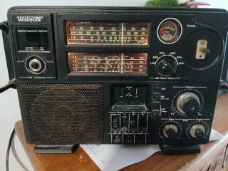 Radio Watson con pantalla de frecuencia digital y múltiples bandas. - Diseño clásico en color negro y detalles marrones. - Incluye sintonizador de AM/FM y bandas de onda corta (SW). - Panel frontal con diales y botones para ajuste de banda y volumen. Funciona correctamente pero le falta una rueda de plástico.