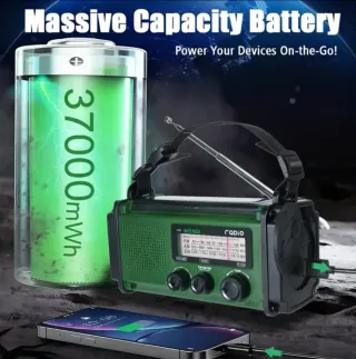 Radio portátil con múltiples funciones, diseñada para situaciones de emergencia o para uso diario. Nueva, a estrenar. Su diseño compacto la hace fácil de llevar a cualquier lugar. - 4 posibles metodos de carga: placa solar, manivela, USB o pilas. - Panel solar integrado para carga. - Antena extensible para mejor recepción. - Puedes utilizarla como batería externa para cargar dispositivos electrónicos como el móvil con 10.000 mAh. - Alarma SOS para situaciones de emergencia. - Incluye brújula. - Correa de transporte. - Puerto de carga USB.