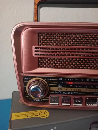 Radio estilo retro con un diseño clásico y llamativo. Es moderna reproduce usb aux y tarjeta de memoria que doy de regalo la que tiene puesta. - Acabado en color rojo brillante. - Asa superior para facilitar su transporte. - Dial analógico para sintonizar emisoras.