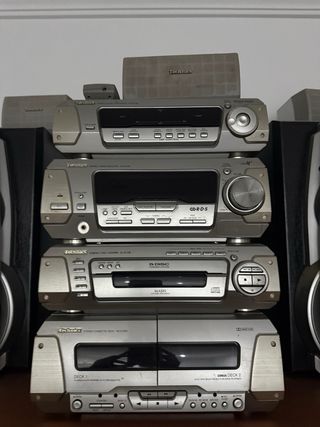 Sistema de sonido Technics con varios componentes apilados. - Unidad principal con reproductor de CD y radio. - Amplificador. - Altavoces. - Diseño elegante en plata y negro. Marca Tecnics Cambio 5 cds