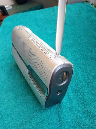 Radio Vieta con base para entrada, reproduccion y carga Ipod. - Radio FM con 20 memorias. - Puerto usb, alarma, funcion sleep, entrada auriculares, reproductor mp3 y mando a distancia. - Altura 16 cm, delante 14 cm y lateral 20 cm - Incluye IPOD mini azul 8 Gb con funda protectora y bateria de tiempo limitado pero que funciona con autonomia y con reproductor. - Solo venta presencial en mano.