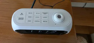 Radio despertador con función de proyector. - Diseño moderno en blanco y negro. - Botones de control en la parte superior.