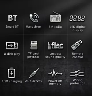 Reproductor estéreo para coche BQCC. - Panel frontal extraíble. - Compatible con FM, WAV y MP3. - Puertos USB y SD para reproducción de música. - Entrada AUX para conectar dispositivos externos. - Pantalla digital. - Botones de control de volumen y navegación.